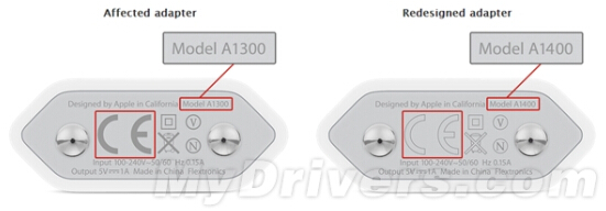 存在過熱問題的iPhone充電器型號(hào)為A1300,CE標(biāo)識(shí)為純灰色。如果你的充電器是A1300,請(qǐng)立即停止使用,更換新款A(yù)1400,在沒有拿到新充電器前可以使用USB電纜連接電腦充電。