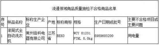 北京時間8月21日消息,北京市工商局最新公示的流通領域洗衣機類商品質量抽查檢驗結果顯示,標稱“常州倍科電器有限公司”生產的“BEKO”牌WCY 81231 PTML 8.0kg規格滾筒式全自動洗衣機存在質量問題,主要問題為用電量不符合相關標準的要求。