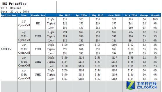 IHS本次公布的面板價格更新日期為2016年7月20日,其中,32英寸720P高清面板最高漲幅為6美元,最高報價為65美元;40英寸1080P全高清面板最高漲幅為5美元,最高報價為96美元。43英寸全高清面板,最高漲幅為3美元,最高報價為102美元。在4K超高清面板方面,49英寸UHD面板最高漲幅為2美元,最高報價為139美元。55英寸4K超高清面板,最高漲幅為2美元,最高報價為195美元。