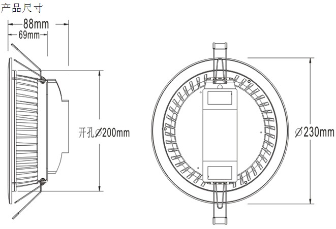 8寸筒燈尺寸:φ230*h60mm 開孔尺寸:φ200mm