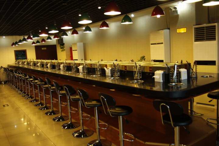 2、節省人力物力:客人在各自的座位上可隨意選擇擺放在輸送帶上的食品,無需服務員送上,本機以臺架代替餐桌,可節省大量餐桌及臺布